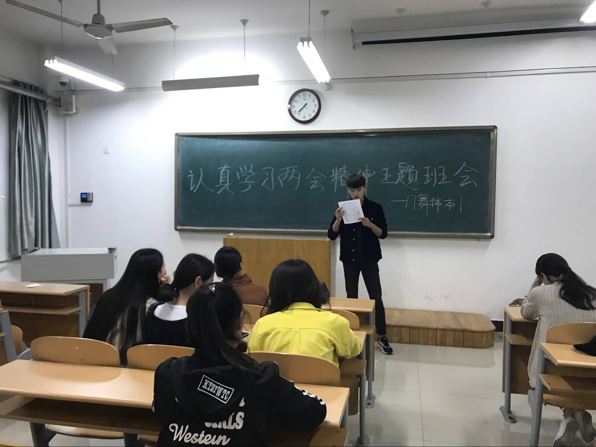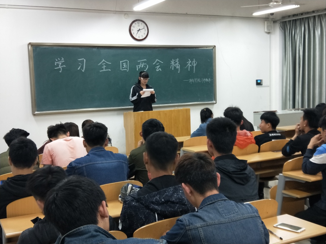 首先各班班主任向大家介绍了全国两会的主要工作以及深入贯彻学习两会精神的重要性,生动地解析了两会中提出的各大热点问题,并结合当代大学生的生活实际对热点话题提出独到的看法,让全国两会更贴近大学生生活。然后让同学们进行分组讨论,进一步学习了两会的重要精神并写下了心得体会。