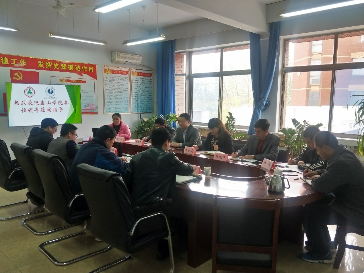 副院长张红霞根据去年审核评估中的工作情况,详细的介绍给泰山学院,从突出亮点与特色等方面介绍了我院在本科教学工作审核评估中的经验和做法。英国365集团殷晓辉、籍建东、姚健、孙洁、董锦秀老师在本科教学评估中对所负责部分,详细介绍具体思路和做法。双方就本科教学工作审核评估相关事宜进行了对**流。