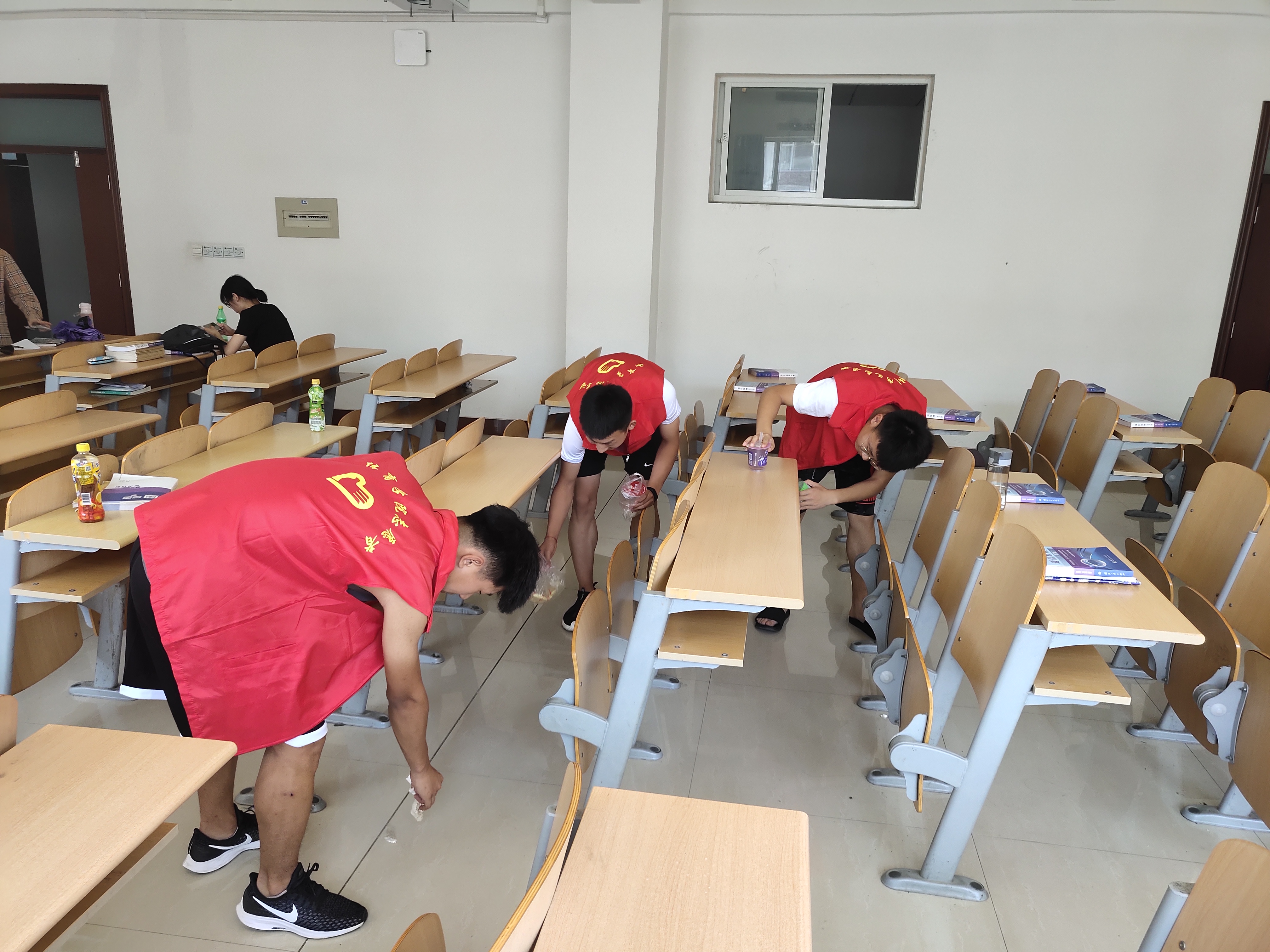 志愿者按照时间要求准时集合完毕,进行简单分工后,开始了清扫活动。在清扫活动过程中,志愿者热情洋溢,互相帮助,针对墙面污点、卫生死角、桌椅摆放、地面灰尘等问题进行了不同方式的处理,经过一个多小时的努力,使整个教室焕然一新。