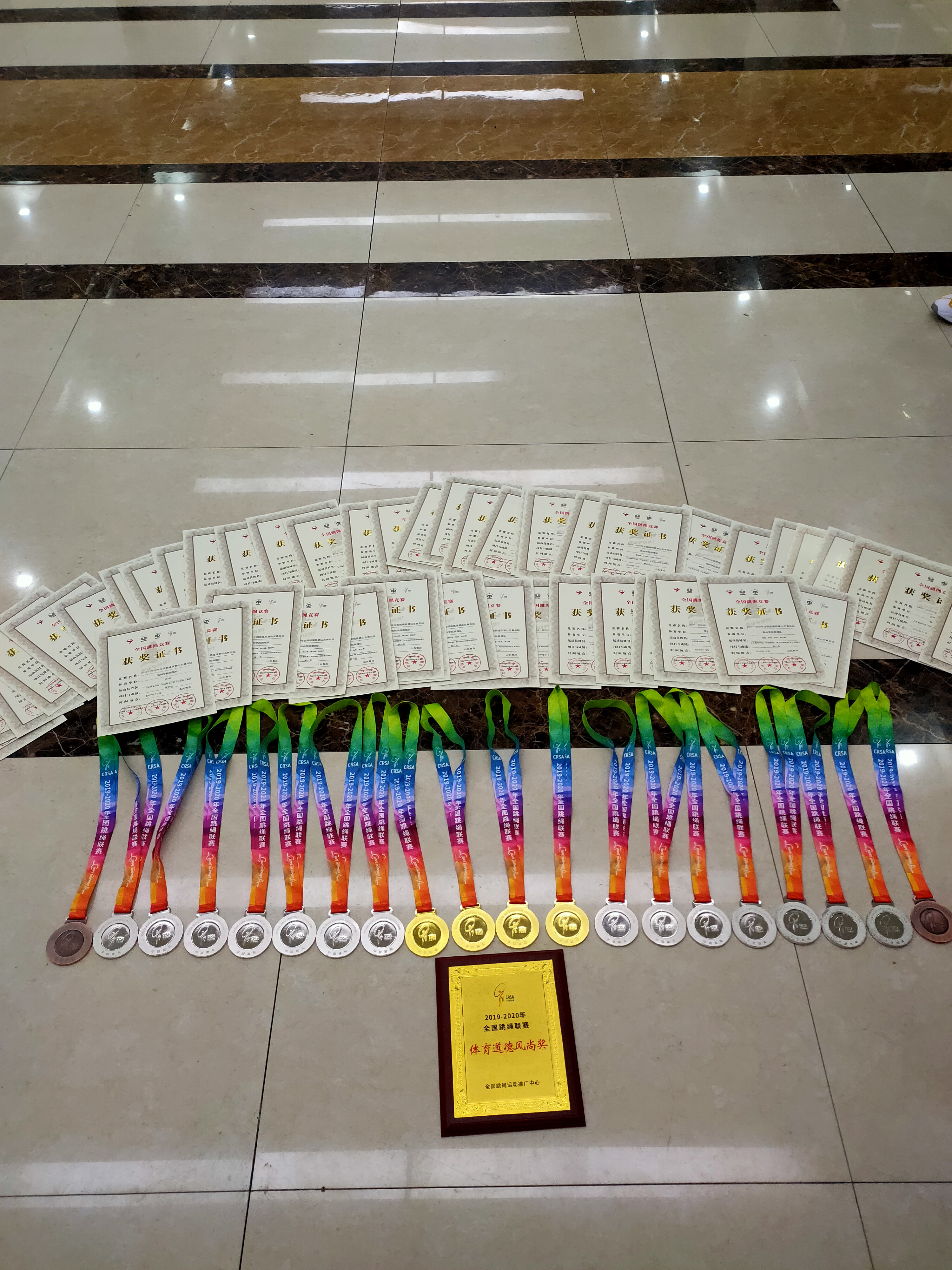 本次比赛有来自全国的600多名运动员围绕4个大项25个小项展开激烈的角逐。滨州学院跳绳队18名队员们参加 了25个小项的比赛。这次比赛是精英间的角逐,不仅考验运动员体力和技术,更考验队员们的临场心理素质等综合能力。充分体现了队员们的合作精神与荣誉的自我效能感,将跳绳比赛的合作与竞争精神展现的淋漓尽致。经过两天的紧张比赛,队员们顽强拼搏,最终共斩获了6金、13银、2铜的佳绩,并首次荣获“体育道德风尚奖”,其中25个小项中19个项目获得小组前三名,晋级全国跳绳联赛总决赛的资格。