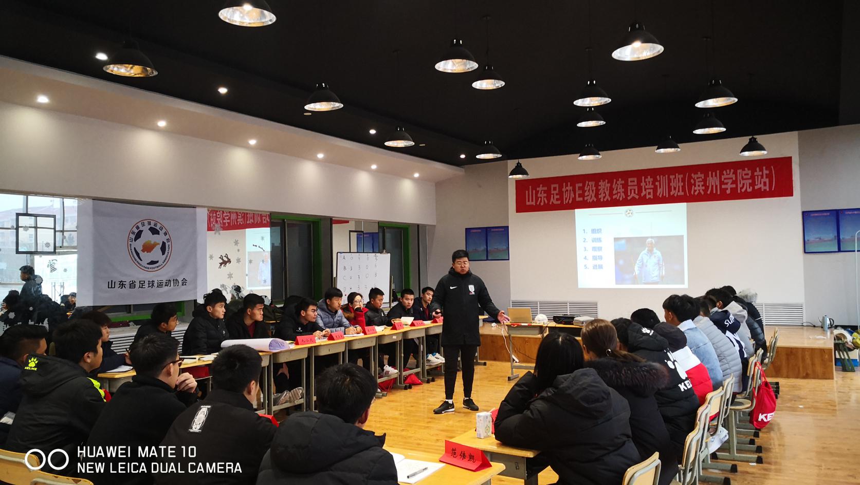 2019年12月6日至12月8日,由山东省足球协会主办,滨州市体育局承办的2019年山东足协E级教练员培训班在滨州学院举行,山东省足球协会教练员讲师杨大志、宿广庆负责本次培训班的授课。经过筛选,共30名学员参加培训。培训分为理论和实践两个部分,3天的课程围绕足球基本技战术及意识、足球训练方法及训练计划、教练员职责与要求等方面进行了培训。通过理论和实践考试的学员将获得山东省足协E级足球教练员资格证书,成绩优秀的学员有机会被推荐至中国足协D级教练员培训班。