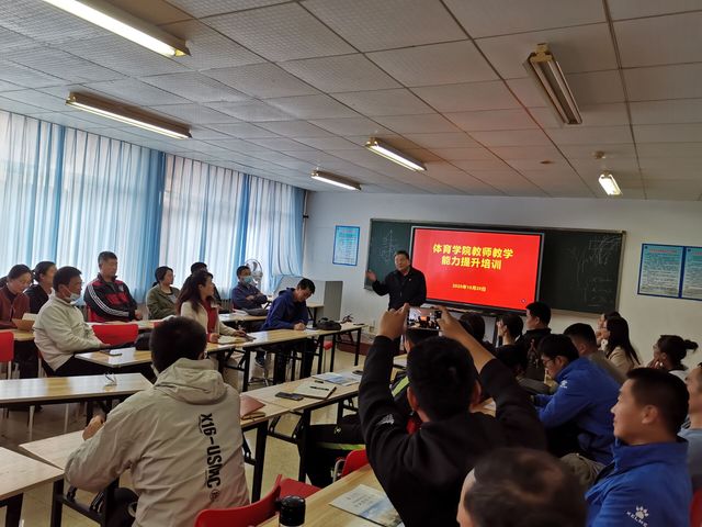 会议由郭波副院长主持,第一阶段由周新老师主讲“课程教学设计与组织实施”,第二阶段由田德宝和宋佩双老师主讲“体育术科教学基本技能”,周新老师从教书育人、课的结构、教学的重点难点、思政育人四个方面进行了讲述,针对体育运动项目的特点,采取不同的教学方法与手段,重点强调了体育课在教学过程中穿插人格塑造,充分发挥体育功效的重要作用。在“体育术科教学基本技能”阶段中,田德宝和宋佩双老师分别从准备活动的重要性,课的组织的规范性,不同准备活动类型对身体不同部位的影响,如何使体育课活跃有趣,以及针对每个学期天气情况的变化设计不同的准备活动内容,充分调动学生学习的积极性等方面进行了详细介绍。之后,张红霞院长引导老师们进行了讨论交流,王荣森、赵仙伟、崔丽等三位老师分别交流了自己的教学体会,大家积极展开讨论,对提升我院教师教学能力起到积极的促进作用。