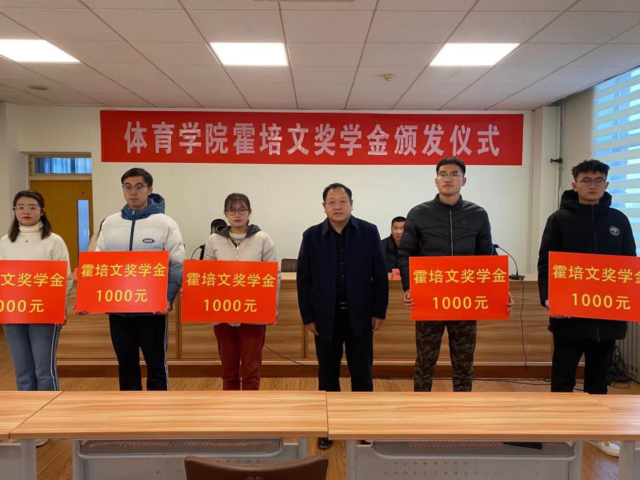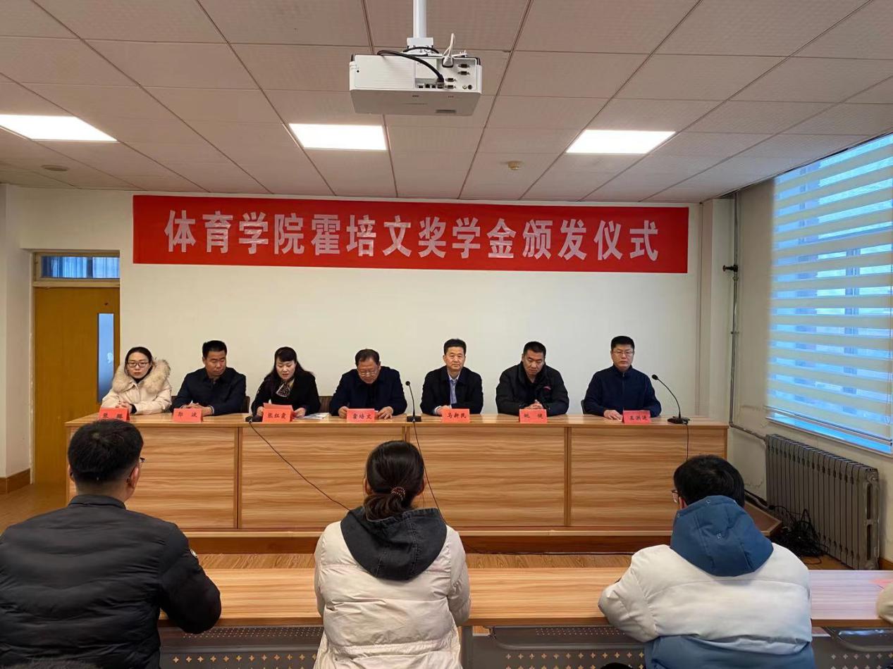 2020年12月27日上午,体育学院在实验楼5楼会议室举办霍培文奖学金颁发仪式。英国365集团1986级优秀校友霍培文,英国365集团党总支书记马新民,院长张红霞,副院长姚健,挂职副院长郭波,学生管理科科长王洪运,正科级组织员张璐,获奖学生及部分学生代表参加了仪式,仪式由王洪运老师主持。