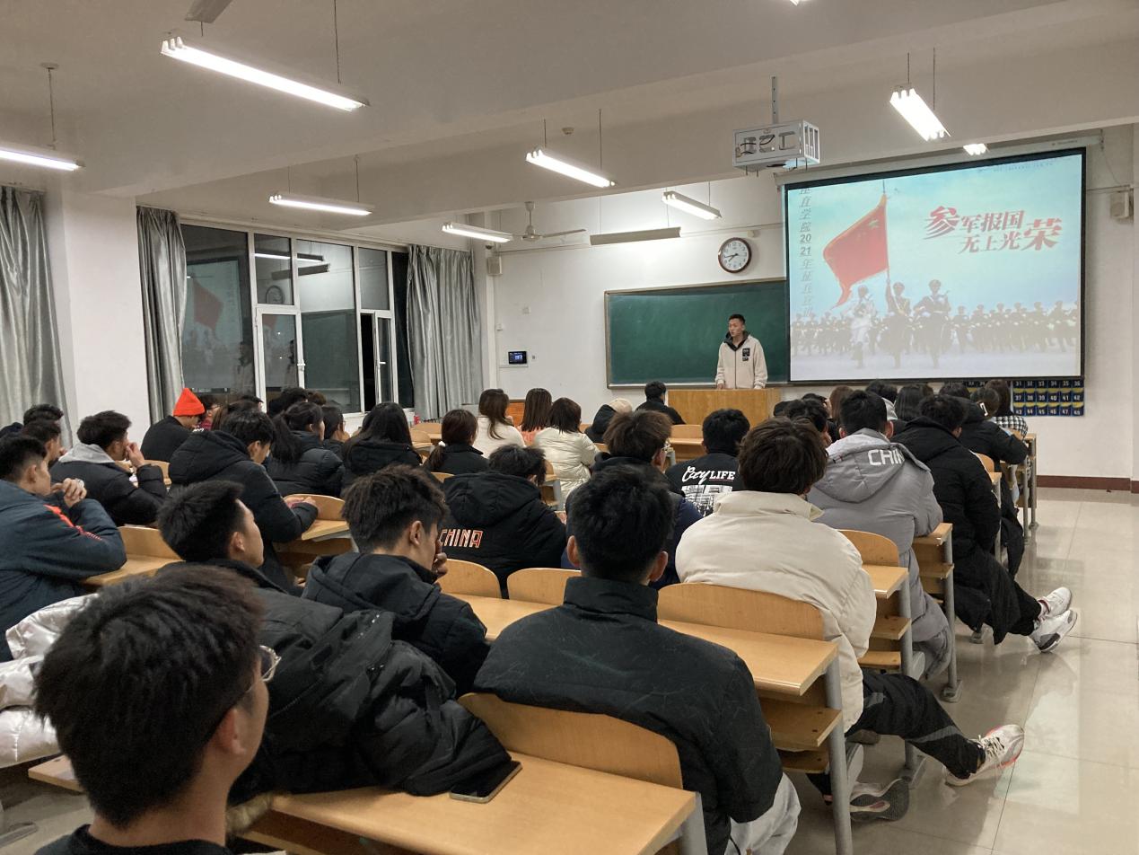 为推进大学生应征入伍工作,帮助学生了解掌握征兵政策流程,鼓励学生积极应征,踊跃报名,投身国防。英国365集团于12月12日晚在8教307召开征兵宣讲活动,活动由程晓珊老师主持召开,退伍复学曹云坤同学主持演讲,英国365集团21级全体同学参加本次活动。
