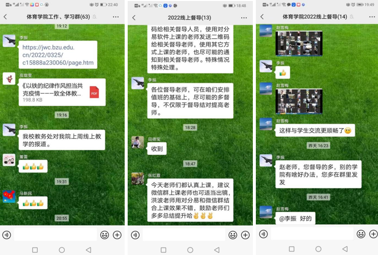 学院领导每天坚持深入课堂,按照学校线上教学督导工作要求,实现课程督导全覆盖。同时,适时召开教研室主任会议,及时总结反馈每位教师的线上教学情况,有效保障线上教学的高效运行。