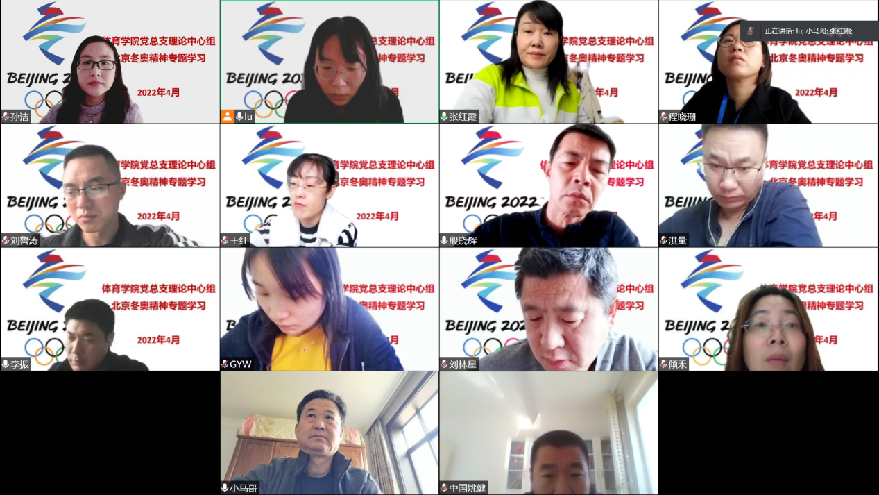 大家集体学习了习近平总书记在北京冬奥会、冬残奥会总结表彰大会上的重要讲话原文、习近平总书记给中国冰雪健儿的回信精神、习近平总书记在3月17日召开的中共中央政治局常务委员会上的重要讲话等内容。大家一致认为,北京冬奥会、冬残奥会是中国人民同各国人民一道,克服各种困难挑战,再一次共创了一场载入史册的奥运盛会,具有里程碑意义。我们要从北京冬奥会这门“大思政课”中不断学习,将北京冬奥精神融入大学生思想政治工作和育人工作体系之中,积极推进体育教育事业发展,将北京冬奥精神转化为投身社会主义现代化强国建设的源源动力。