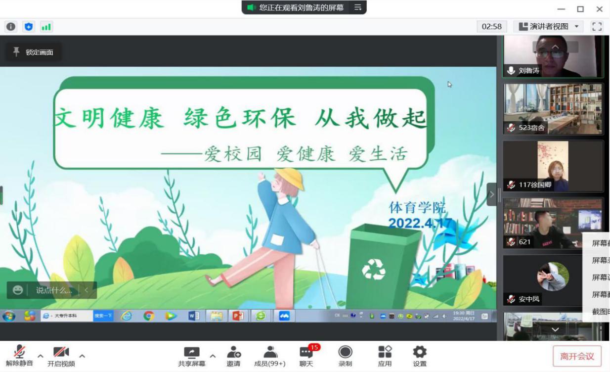 4月17日我院召开“文明健康 绿色环保 从我做起”线上主题教育班会,面向全体学生宣讲爱国卫生月的由来、疫情防控与爱国卫生运动的重要意义、健康的生活方式与习惯等方面知识,教育引导学生在常态化疫情防控形势下树立文明卫生意识,养成积极、健康、环保的生活方式。