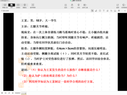 理论课教学相对枯燥,线上要保证每个学生认真听讲难度很大,为此,教研室老师们选取与体育教学、运动训练相关的典型案例,增强教学的针对性和课堂教学的吸引力。例如:在讲运动损伤时,将在体育教学中发生的典型损伤编写成案例和学生一块研究分析。