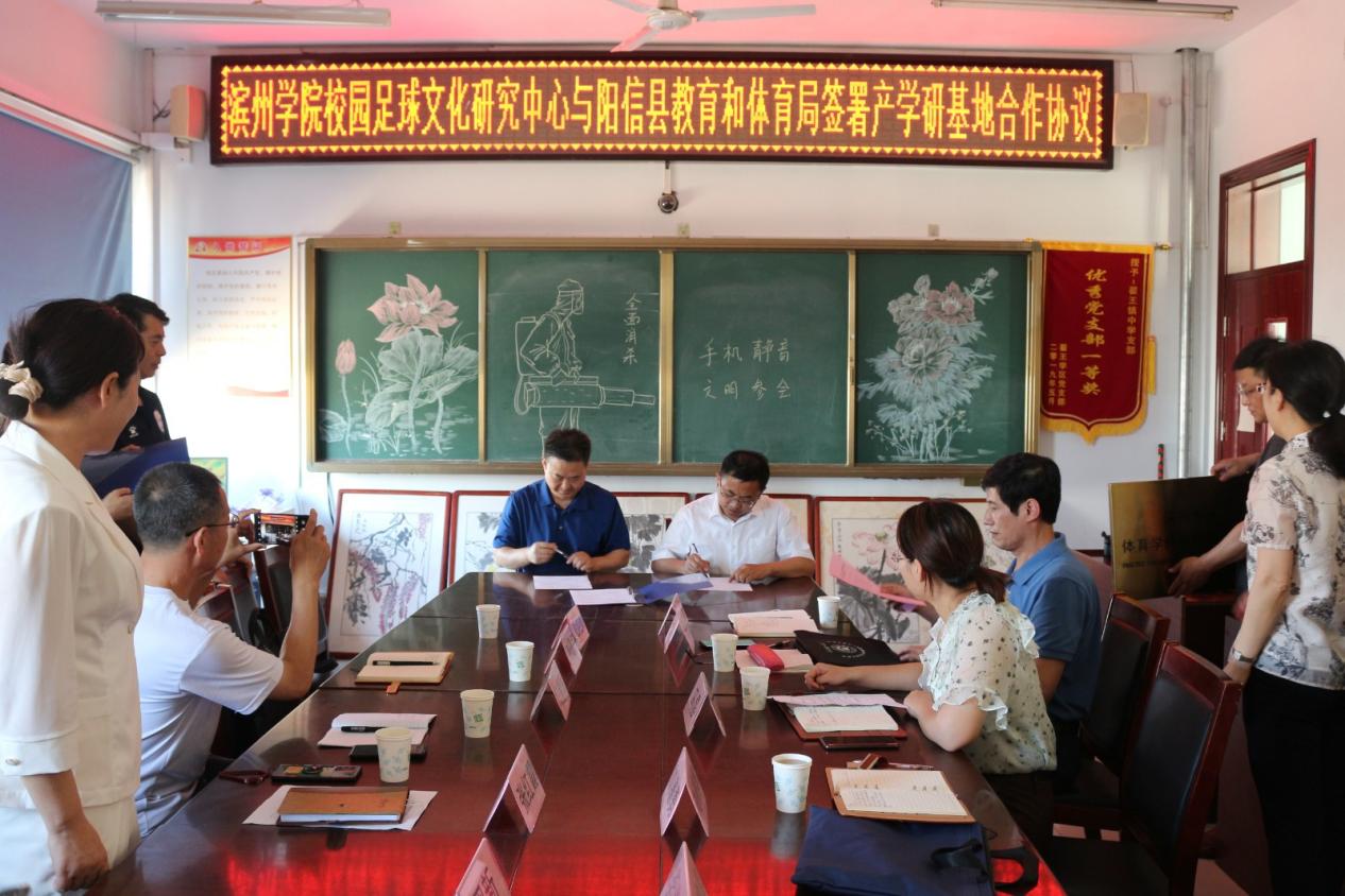 随后,我院与阳信县教体局签订了“校园足球文化研究中心产学研基地”协议,与翟王镇中学签订了“实践教学基地”协议。马新民对翟王镇中学的体育工作给予了极大肯定,对本次实践教学基地建设寄予美好祝愿。张红霞介绍了实践教学基地的发展计划及教学合作期望,希望通过实践教学基地的建设加强交流合作,服务于英国365工作。阳信县教体局党组成员、体育中学党支部书记劳景国对滨州学院英国365集团的支持表示感谢,希望以此为契机,与滨州学院紧密合作,争第一、走在前,实现阳信教育体育的跨越式发展。