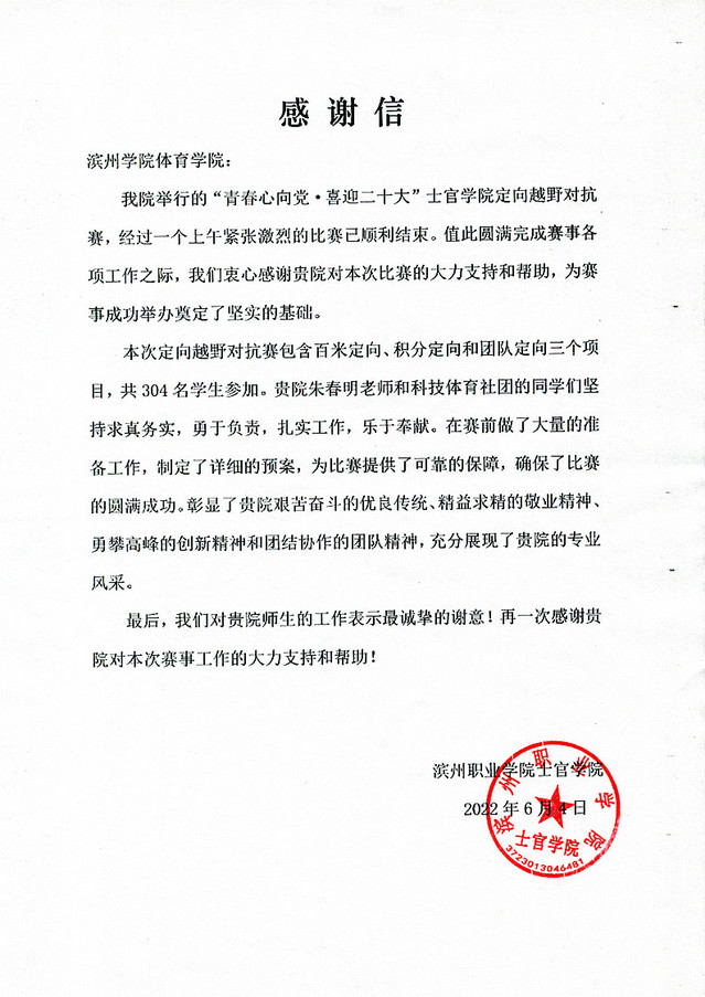 高校学生社团是高校校园文化建设的重要载体,是高校第二课堂的重要组成部分,也是大学生全面发展的一个重要途径。2022年6月4日,滨州职业学院士官学院举行“青春心向党·喜迎二十大”士官学院定向越野对抗赛。我校科技体育社团受邀请,组建学生党员、入党积极分子和共青团员共20人的志愿服务队,在朱春明老师的带领下参与本次比赛的组织和裁判工作。比赛经历一个上午的时间,分为两个阶段3个比赛项目,参赛共计608人次。