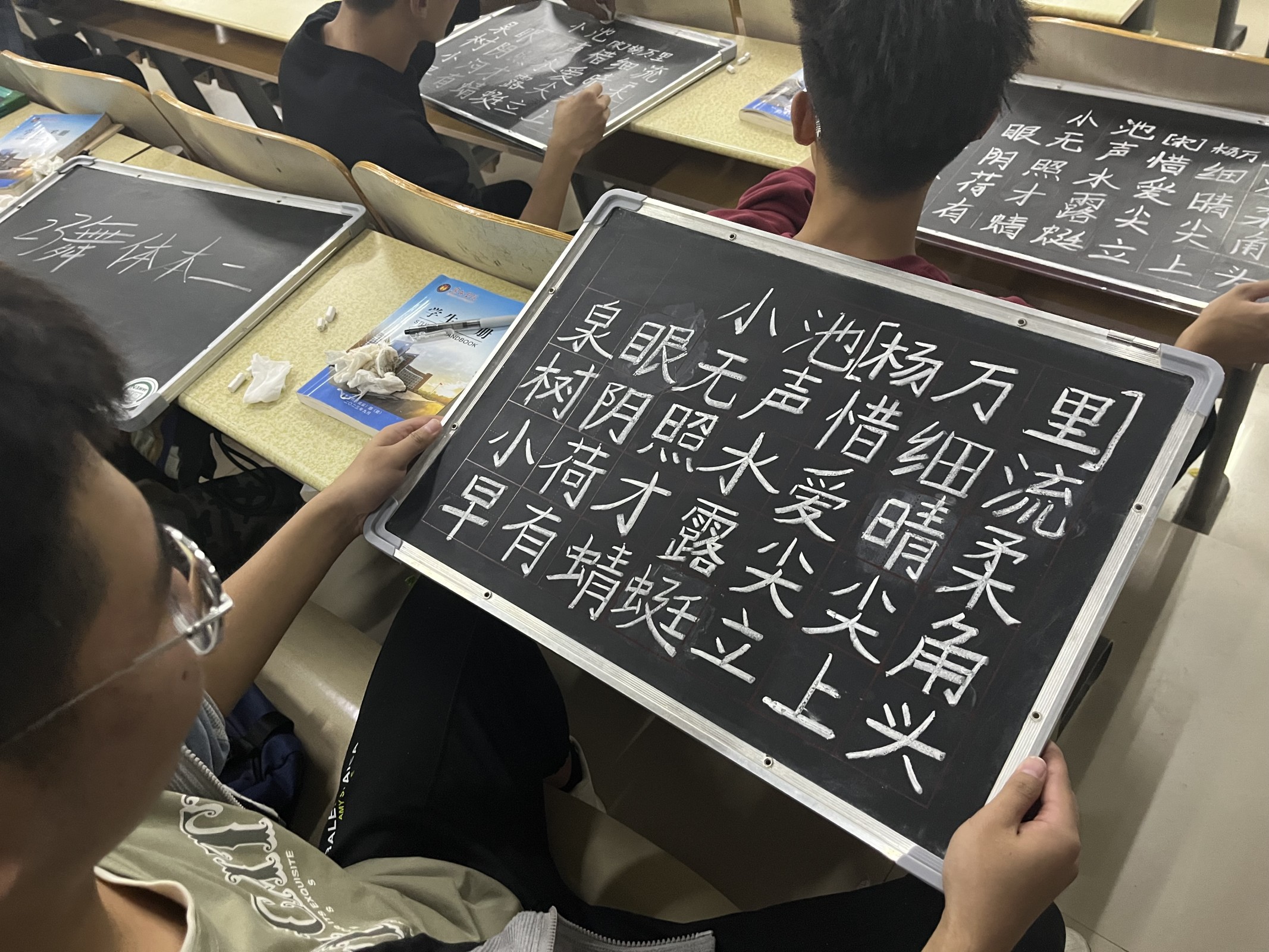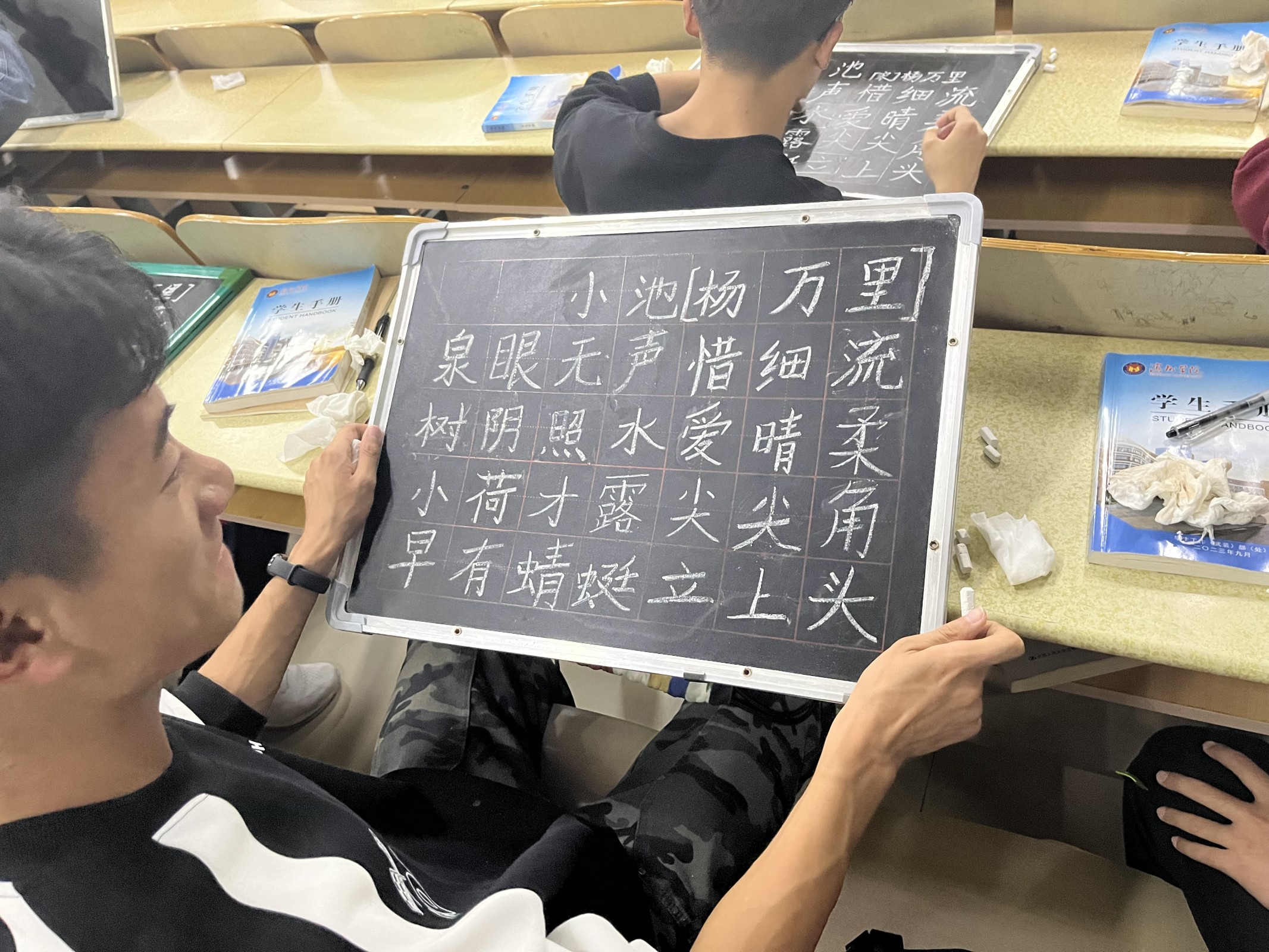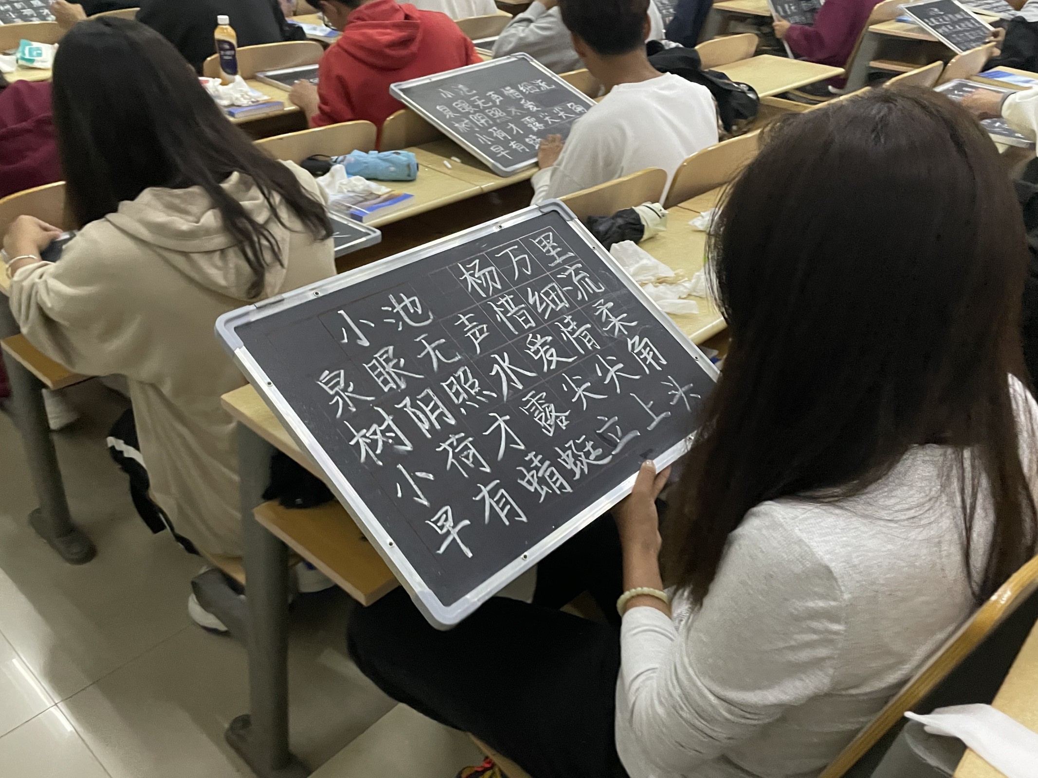 比赛采取现场书写形式进行,书写内容为古诗《小池》,时间为6分钟。同学们沉着冷静、聚精会神,粉笔划过黑板的声音在教室内回荡,留下端正大方、遒劲有力的汉字。大赛也吸引了非师范生的同学前来参加,他们在黑板上也留下了自己的作品。一幅幅富有个性的作品展现在我们眼前,每一幅作品展现了同学们的才情与魅力。最后,由评委根据书法规范、间架结构、行笔运笔等标准对所有选手作品进行点评交流和打分。