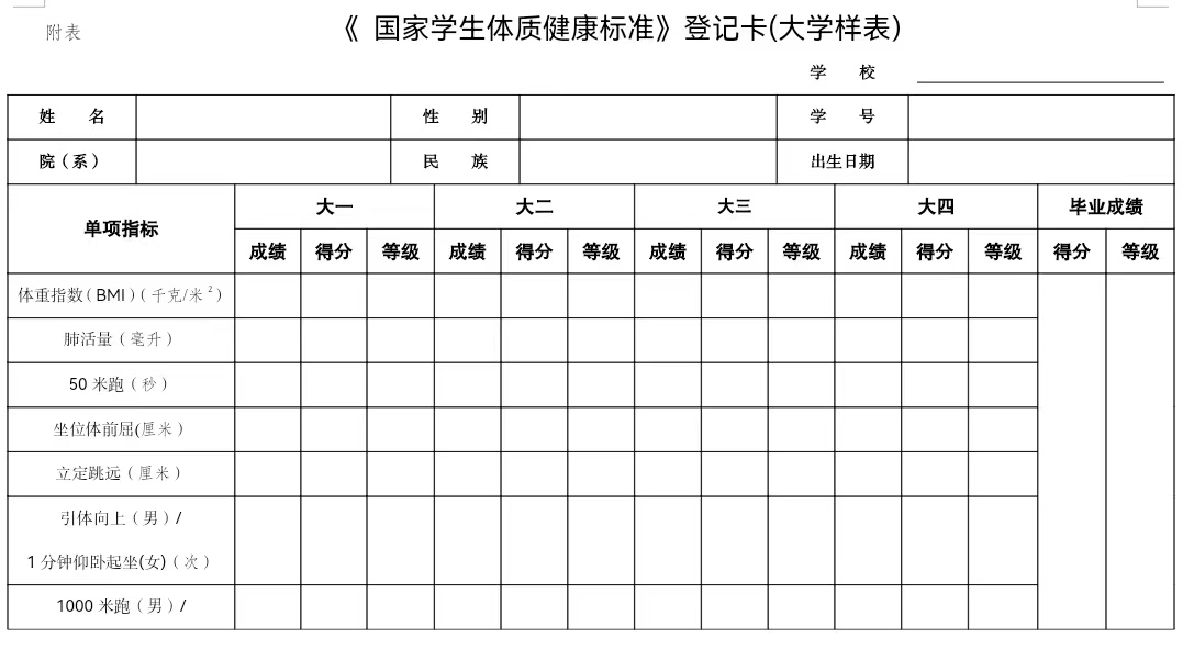 8.指导各二级学院为每位学生建立《〈国家学生体质健康标准〉登记卡》。