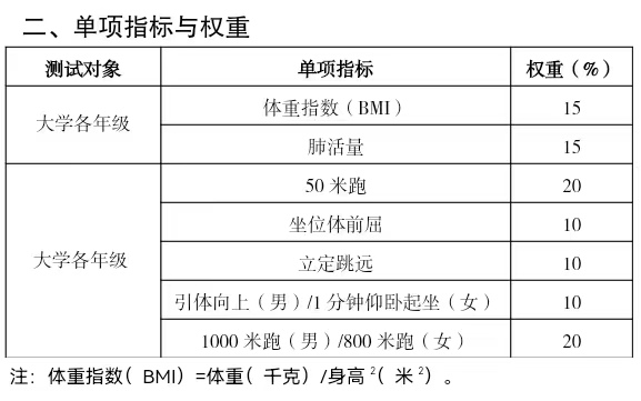 5.小学、初中、高中、大学各组别的测试指标均为必测指标。其中,身体形态类中的身高、体重,身体机能类中的肺活量,以及身体素质类中的50米跑、坐位体前屈为各年级学生共性指标。