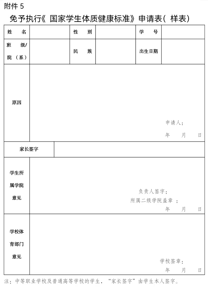 10.学生因病或残疾可向学校提交暂缓或免予执行《标准》的申请,经医疗单位证明,体育教学部门核准,可暂缓或免予执行《标准》,并填写《免予执行<国家学生体质健康标准>申请表》,存入学生档案。确实丧失运动能力、被免予执行《标准》的残疾学生,仍可参加评优与评奖,毕业时《标准》成绩需注明免测。