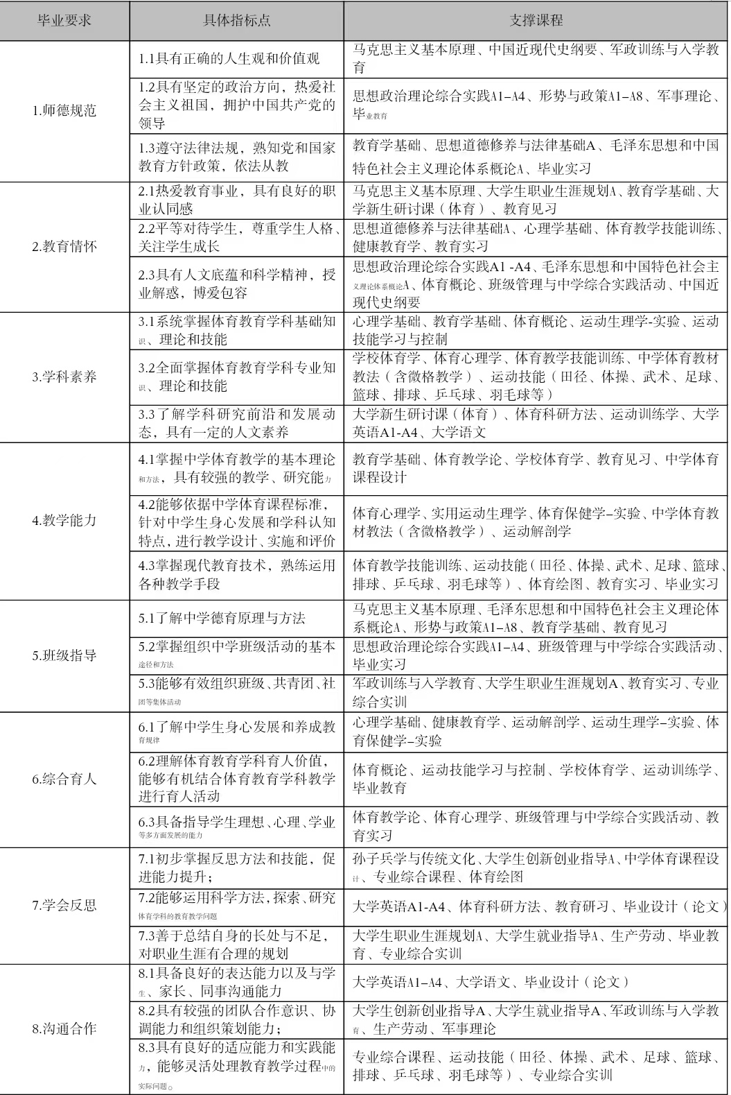 7.【学会反思】具有终身学习与专业发展意识。了解国内外体育改革发展动态,能够适应时代和体育教育发展需求,进行学习和职业生涯规划。初步掌握反思方法和技能,具有一定创新意识,运用批判性思维方法,学会分析和解决体育教育教学问题。