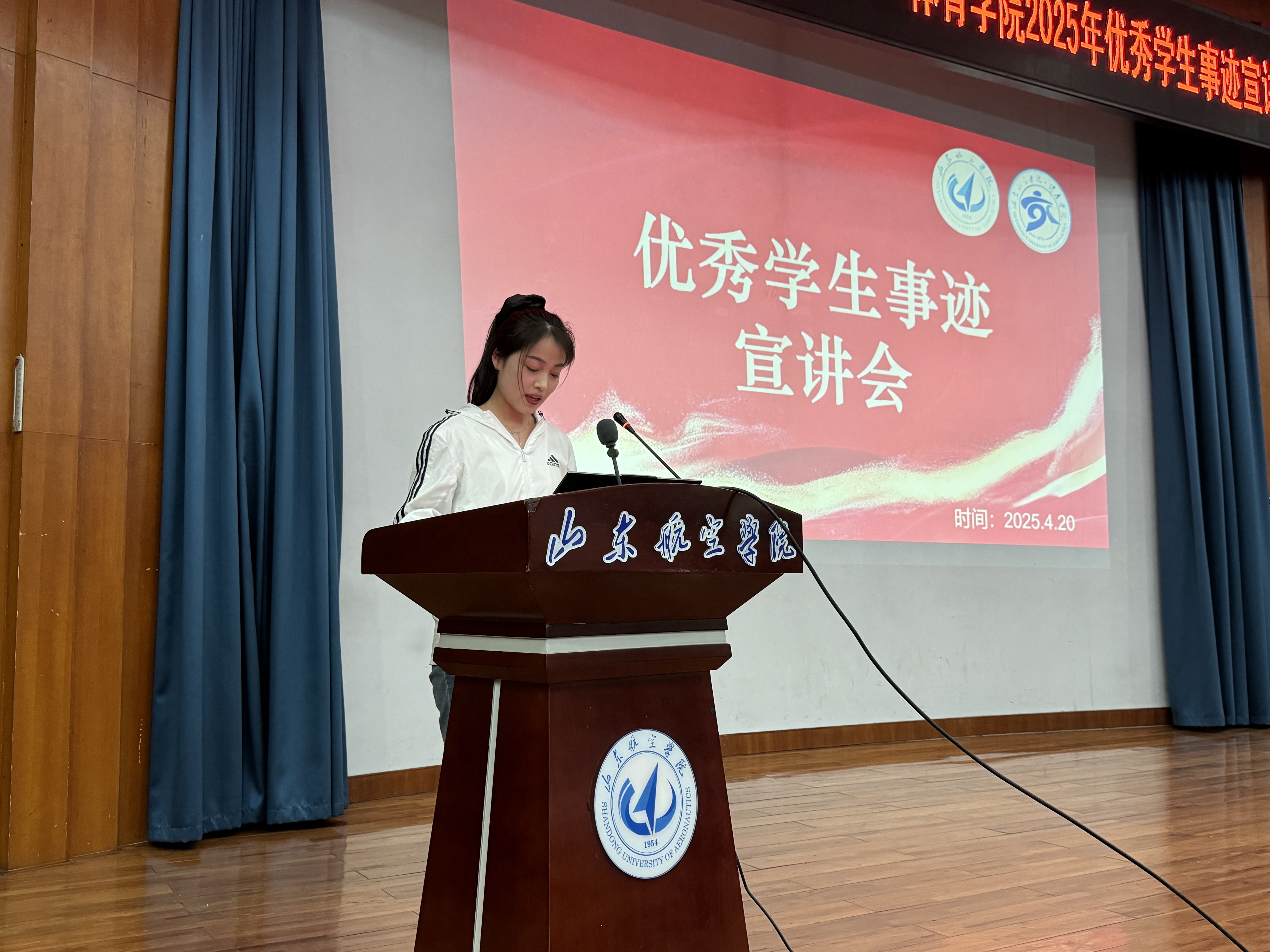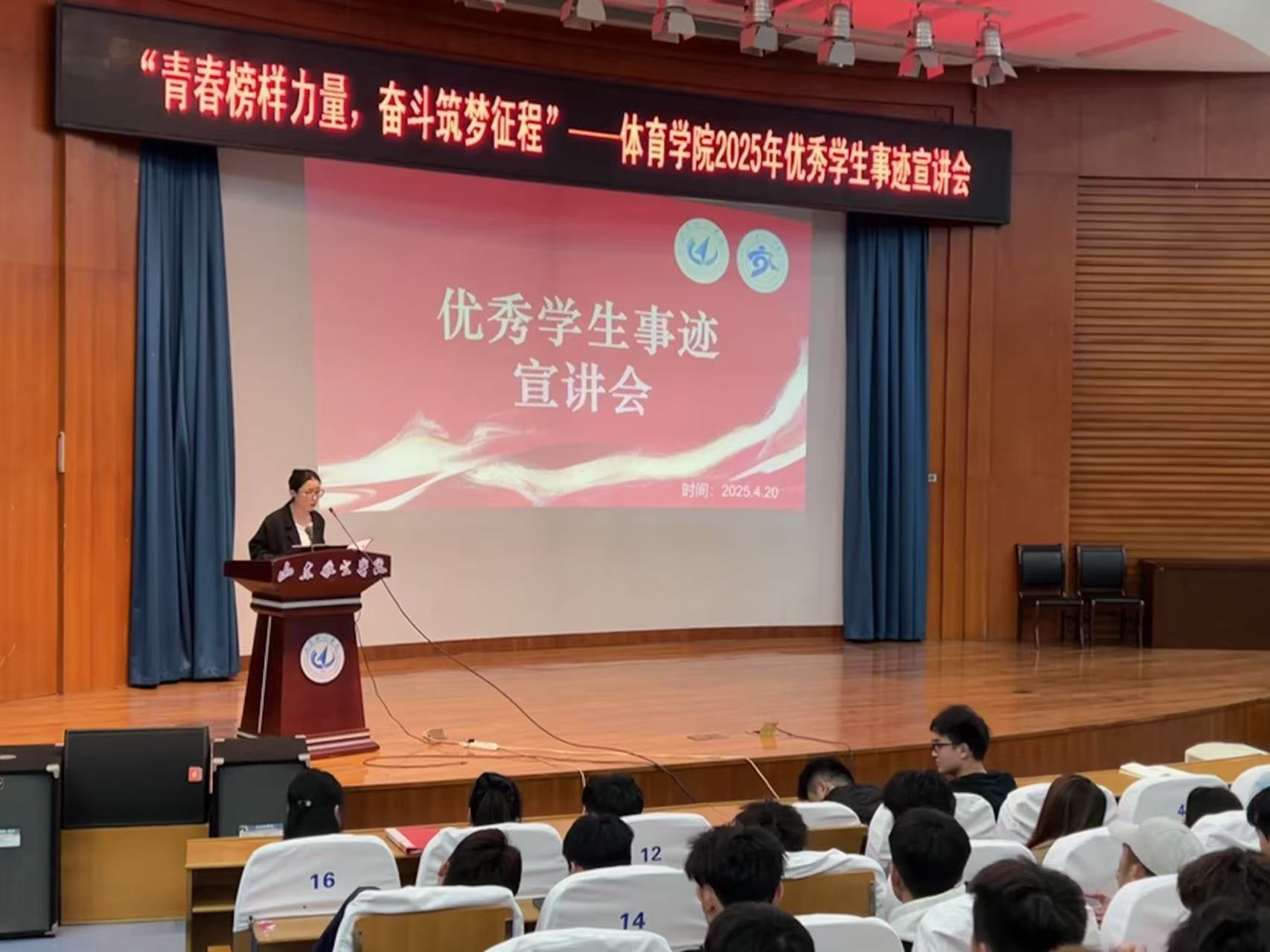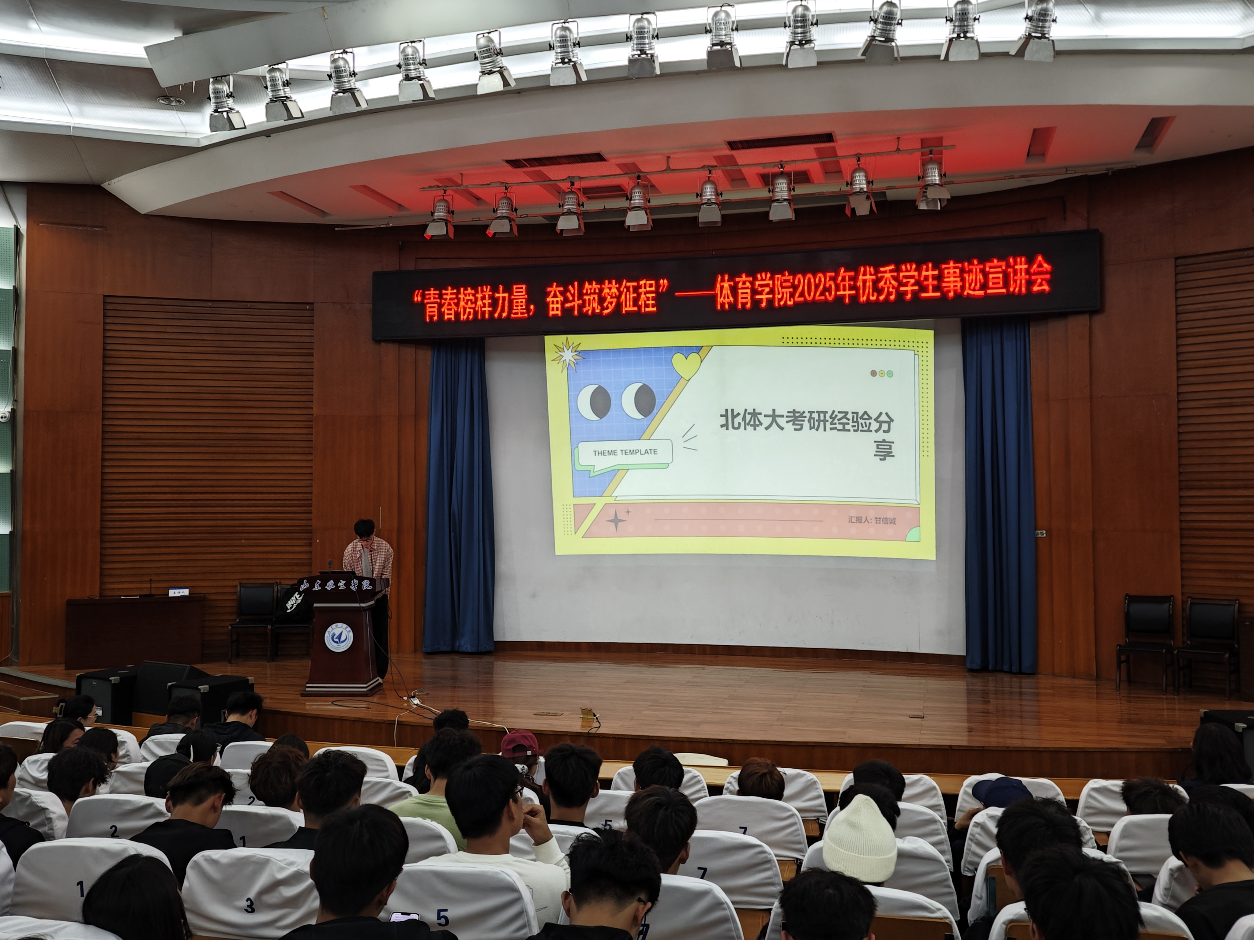 报告会上,6名来自不同领域的优秀学生代表依次登台,以真挚的讲述展现了新时代青年的责任与担当。他们中既有斩获山东省师范类高校学生从业技能大赛一等奖的“专业标兵”,也有以优异成绩考入北京体育大学等知名学府的“深造先锋”;既有在学生工作中获评“十佳学生”的骨干模范,也有创办公司、斩获创新创业竞赛奖项的“实践达人”。通过分享学业攻坚、科研突破、社会实践等经历,他们以鲜活的故事诠释了体育学子“锐意进取、追求卓越”的奋斗精神,现场掌声不断,师生深受鼓舞。
