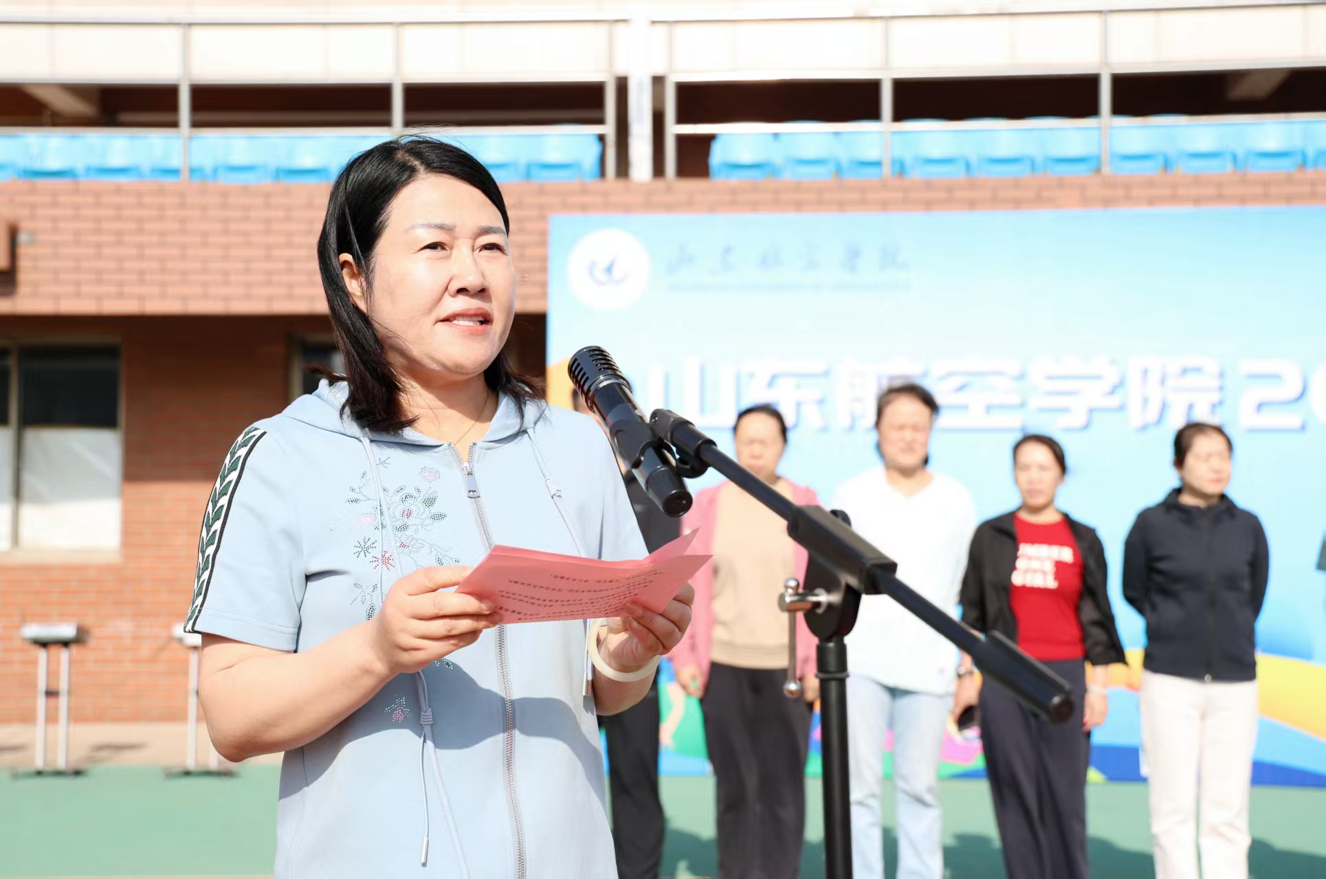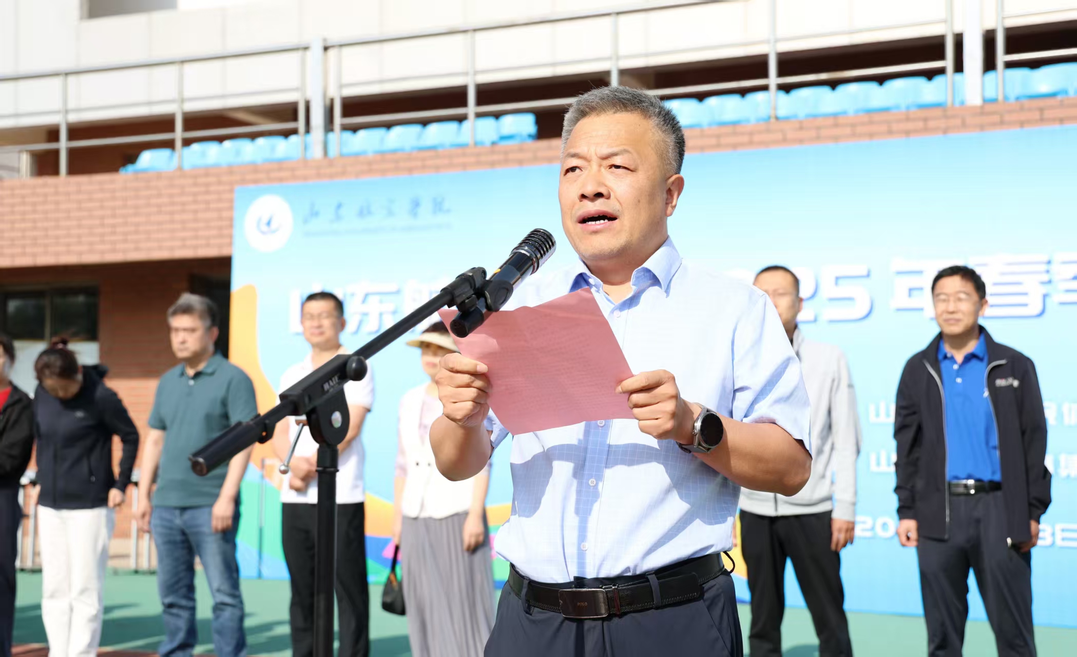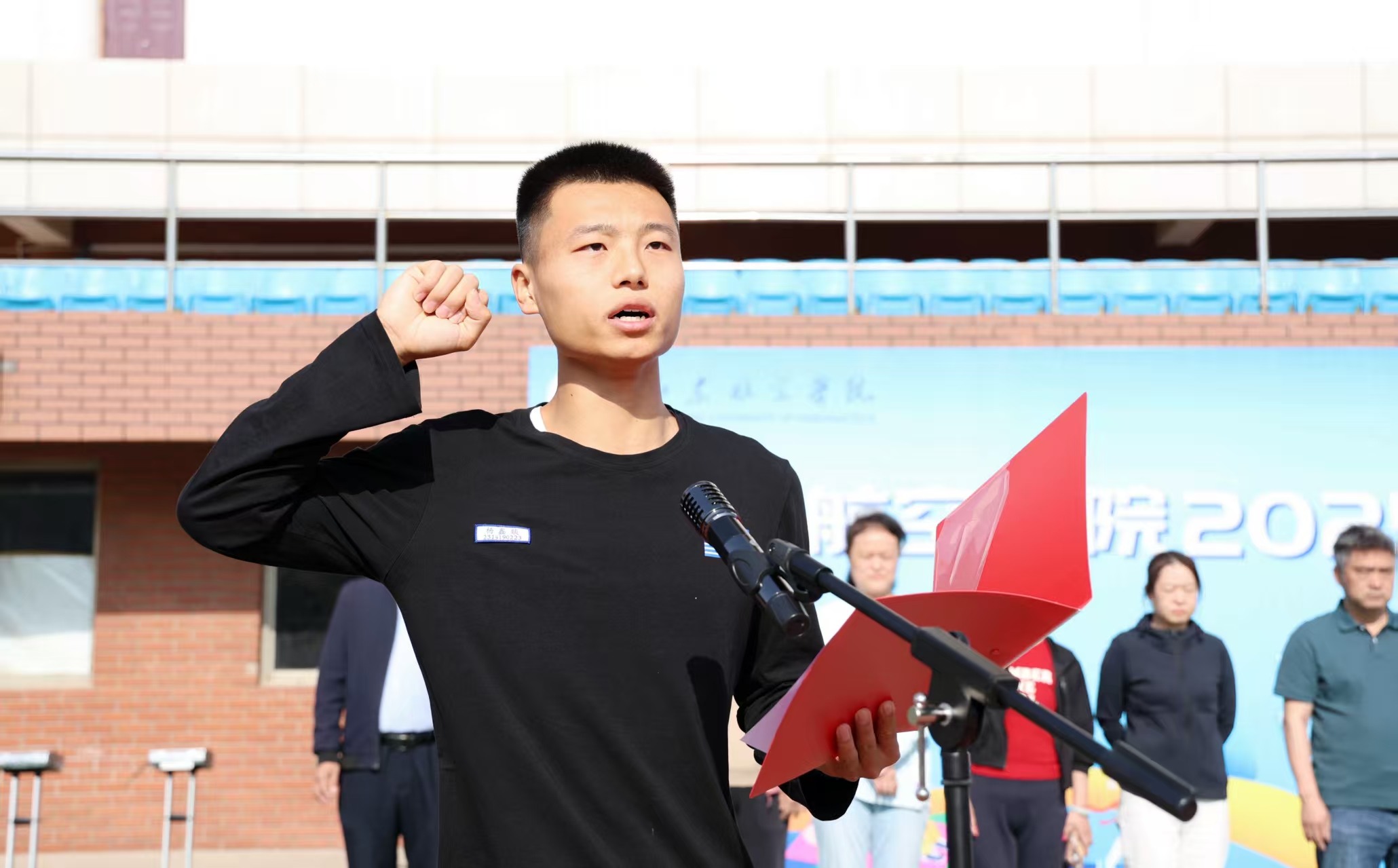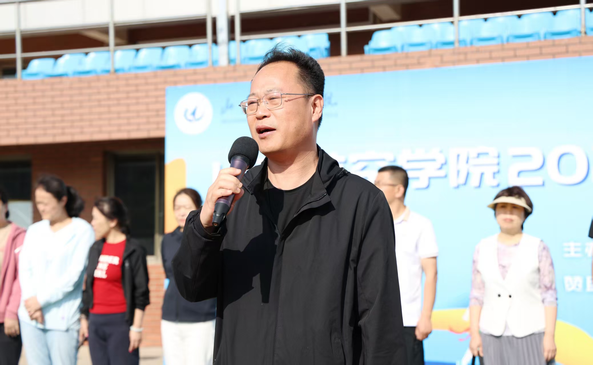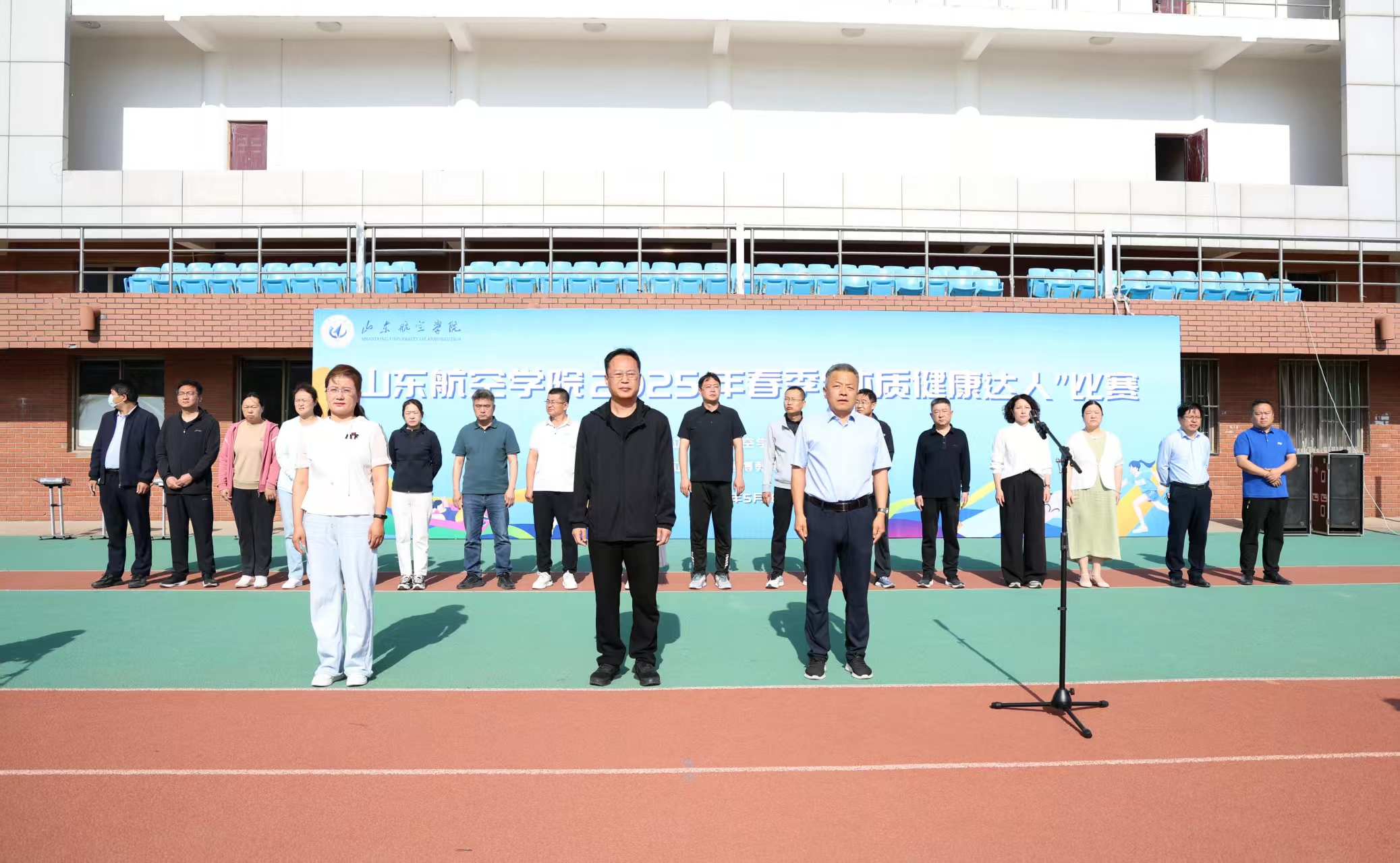 为深入贯彻落实《国家学生体质健康标准》,牢固树立“健康第一”理念,提高学生体质健康水平,5月18日,我校2025年春季“体质健康达人”比赛在校田径场举行。校党委委员、副校长郭新伟,党委委员、副校长刘宝民,党委委员、统战部部长林晓金出席开幕式。教务处、学工处、团委及各二级学院主要负责人,全体裁判员、运动员参加了仪式。