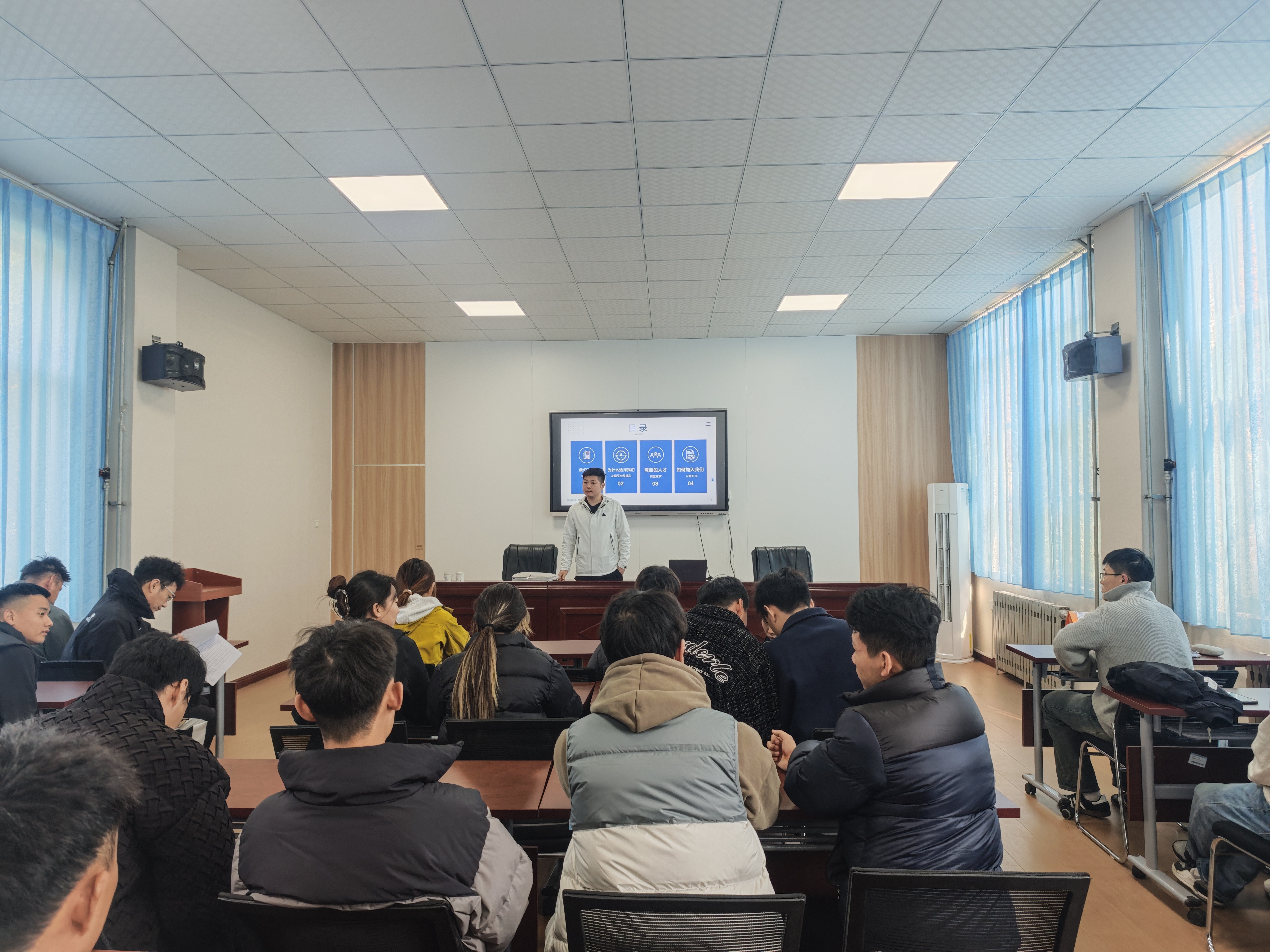 招聘会上,青岛坤羽俱乐部有限公司人力资源经理首先通过企业宣传片,向在场毕业生全面展示了公司的发展历程、业务布局、核心优势以及未来发展规划。随后,围绕本次重点招聘的“青少年羽毛球教练”与“足球教练员”两大核心岗位,企业代表从岗位职责、能力要求、薪资福利、培训机制及职业晋升通道等多个方面进行了系统介绍与详细解读。