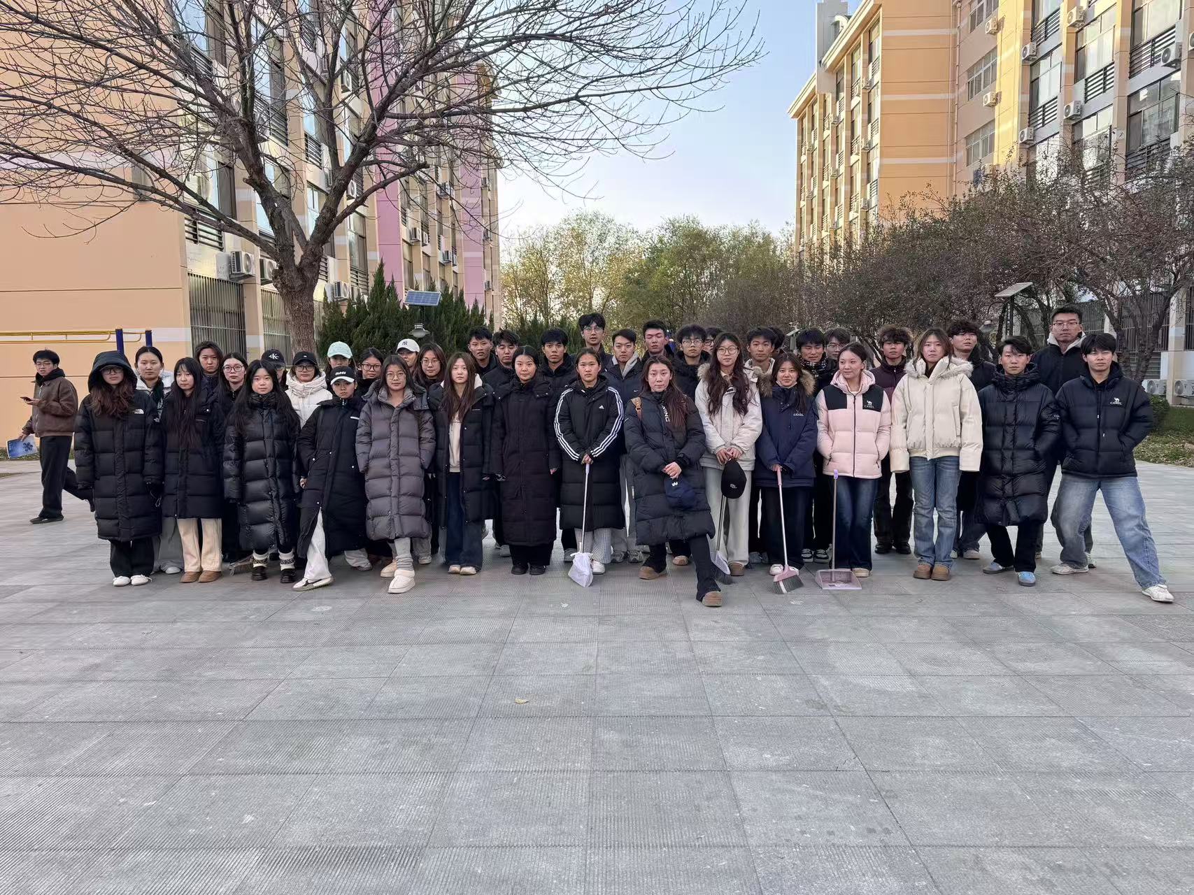 随后,各小组在体育馆门前区域开展环境清扫。同学们使用扫帚、拖把、垃圾夹等工具,分工协作,认真清理纸屑、落叶和卫生死角。之后,大家又前往宿舍楼下,分组清理生活垃圾、快递包装等杂物,将垃圾归拢后进行分类收纳。